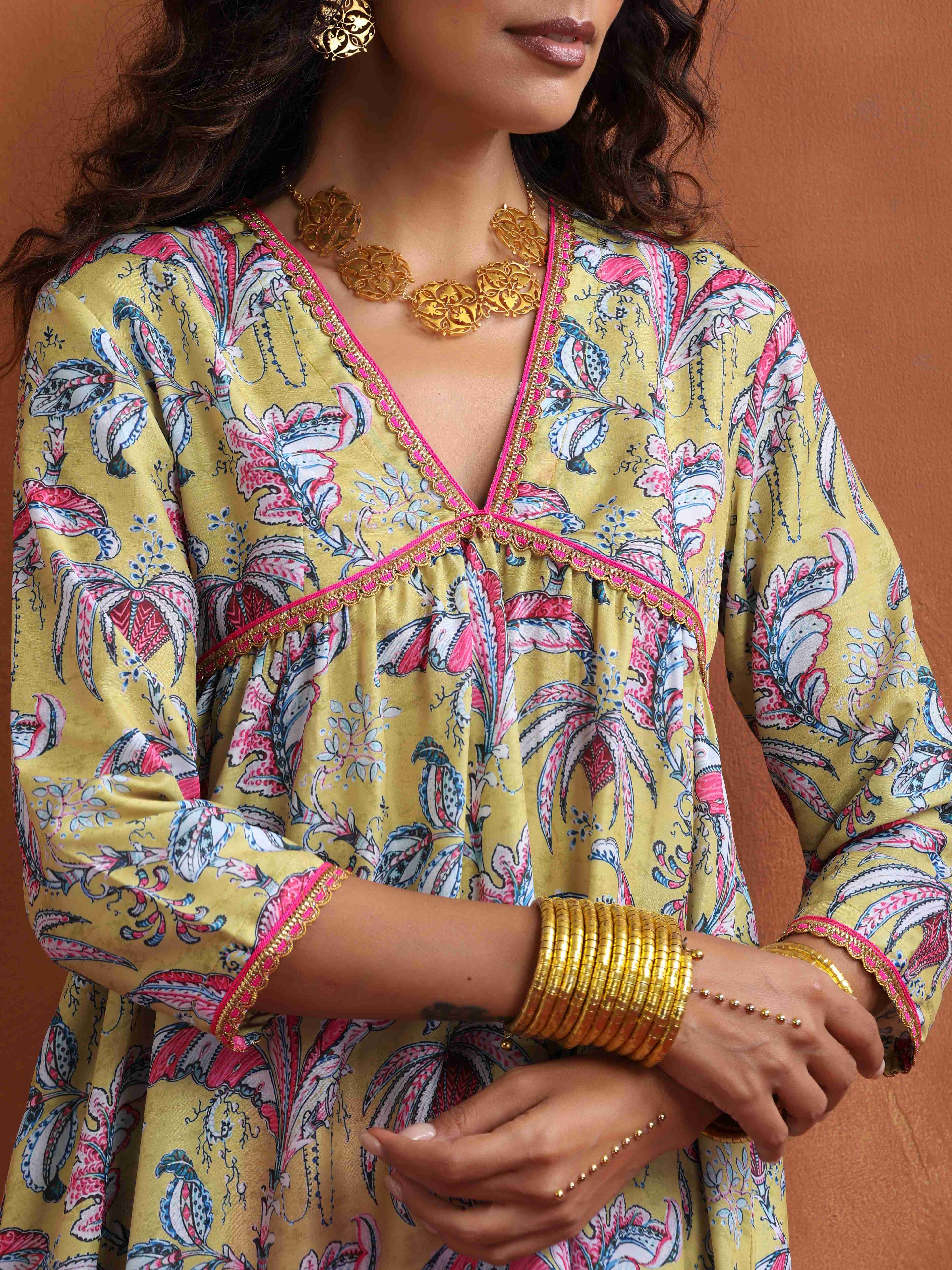 trueBrowns Yellow Print Anarkali Kurta Co-ord Set - XS