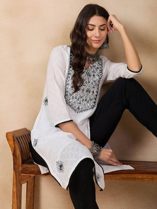 Anouk White Ethnic Motifs Embroidered Mirror Work Detailed Pure Cotton Straight Kurta Product Details Colour: white & black Ethnic motifs embroidered Round neck Three-quarter, regular sleeves Straight shape with regular style Mirror work detail Calf length with straight hem Machine weave regular cotton Size & Fit The model (height 5'8) is wearing a size S Material & Care Pure CottonMachine Wash Specifications Sleeve Length: Three-Quarter Sleeves Shape: Straight Neck: Round Neck Print or Pattern Type: Ethnic Motifs Design Styling: Regular Slit Detail: Side Slits Ornamentation: Mirror Work Length: Calf Length Hemline: Straight Colour Family: Monochrome Weave Pattern: Regular Weave Type: Machine Weave Occasion: Festive Number of Items: 1 Package Contains: 1 kurta Legal Disclaimer: Product colour may slightly vary due to photographic lighting sources or your monitor settings.