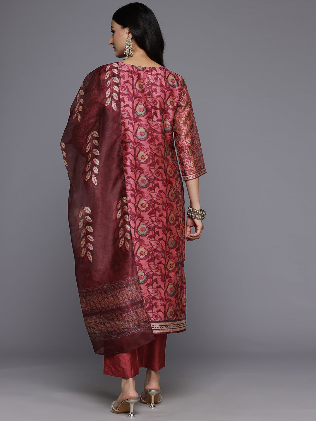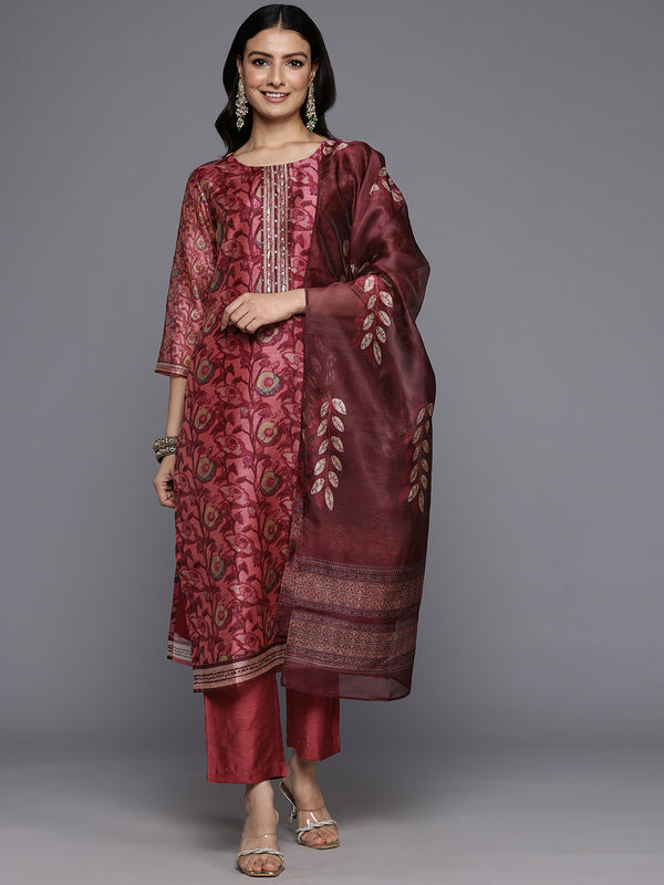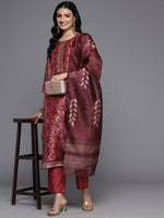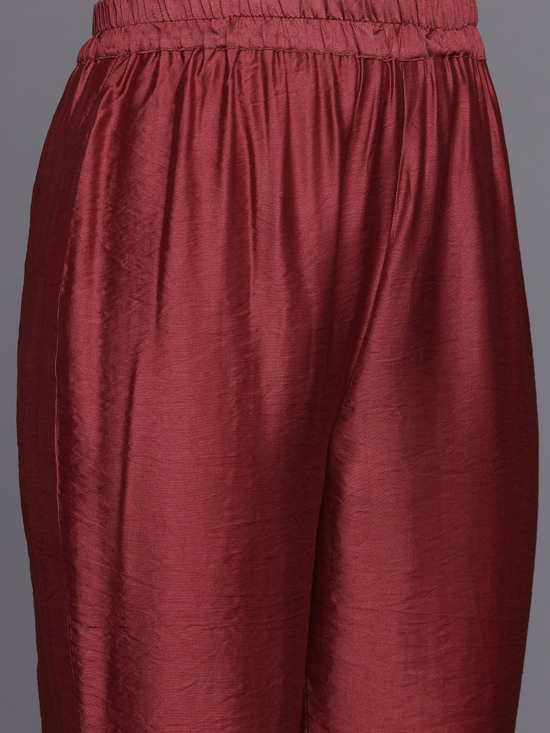 Maroon Floral Printed Round Neck Straight Kurta Paired With Tonal Bottom And Printed, Three Quarter Sleeves