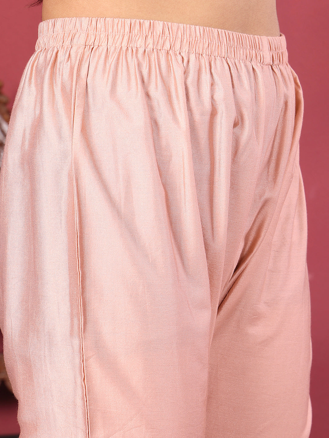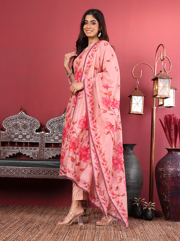 Silk Scalope V Neck Kanth Embroidered, Three Quarter Sleeves, Straight Kurta With Side Slit, Paired With Tonal Bottom And Embroidered Dupatta