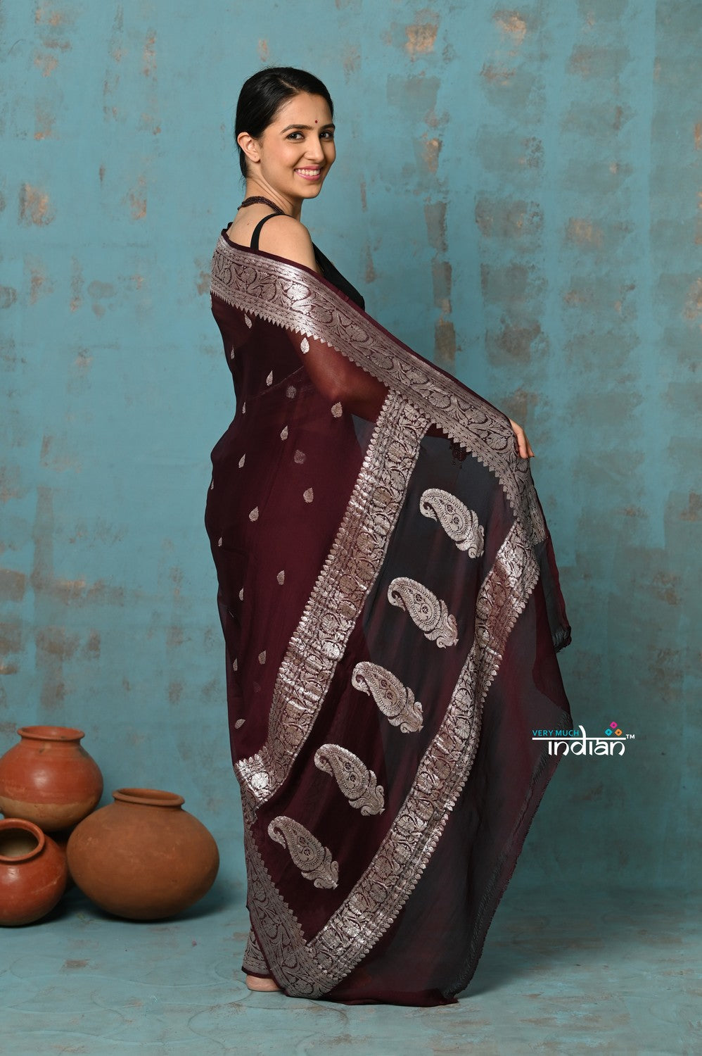 Khaddi Georgette are Banarasi Georgette sarees in which each saree is meticulously hand-woven, showcasing intricate zari work in gold and silver that adorns the fabric with elegant buttis and a heavy pallu. Khaddi georgette has beautiful zari work in the form of buttis and heavy pallu and comes in Ombre colors which are all handmade saree with buttis. The color and the texture of the saree itself tells the whole story. Its embroidery delivers a charm to saree giving you the limelight at first glance & be a conversation starter in your group.