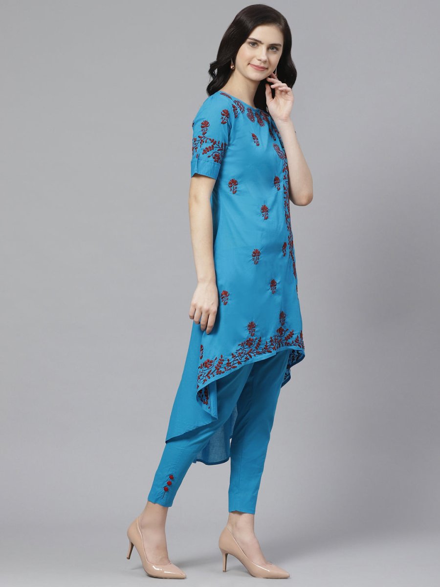 ADA Women Blue & Maroon Chikankari Embroidered High Low Handloom Sustainable Kurta with Trousers Product Details Blue and maroon chikankari ...