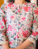 Off White floral printed silk kurta set features elegant sequins and button detailing. This Calf-length A-line fit-and-flare design includes a mandarin collar and three-quarter regular sleeves, paired with solid slip-on pants and a dupatta adorned with sequin