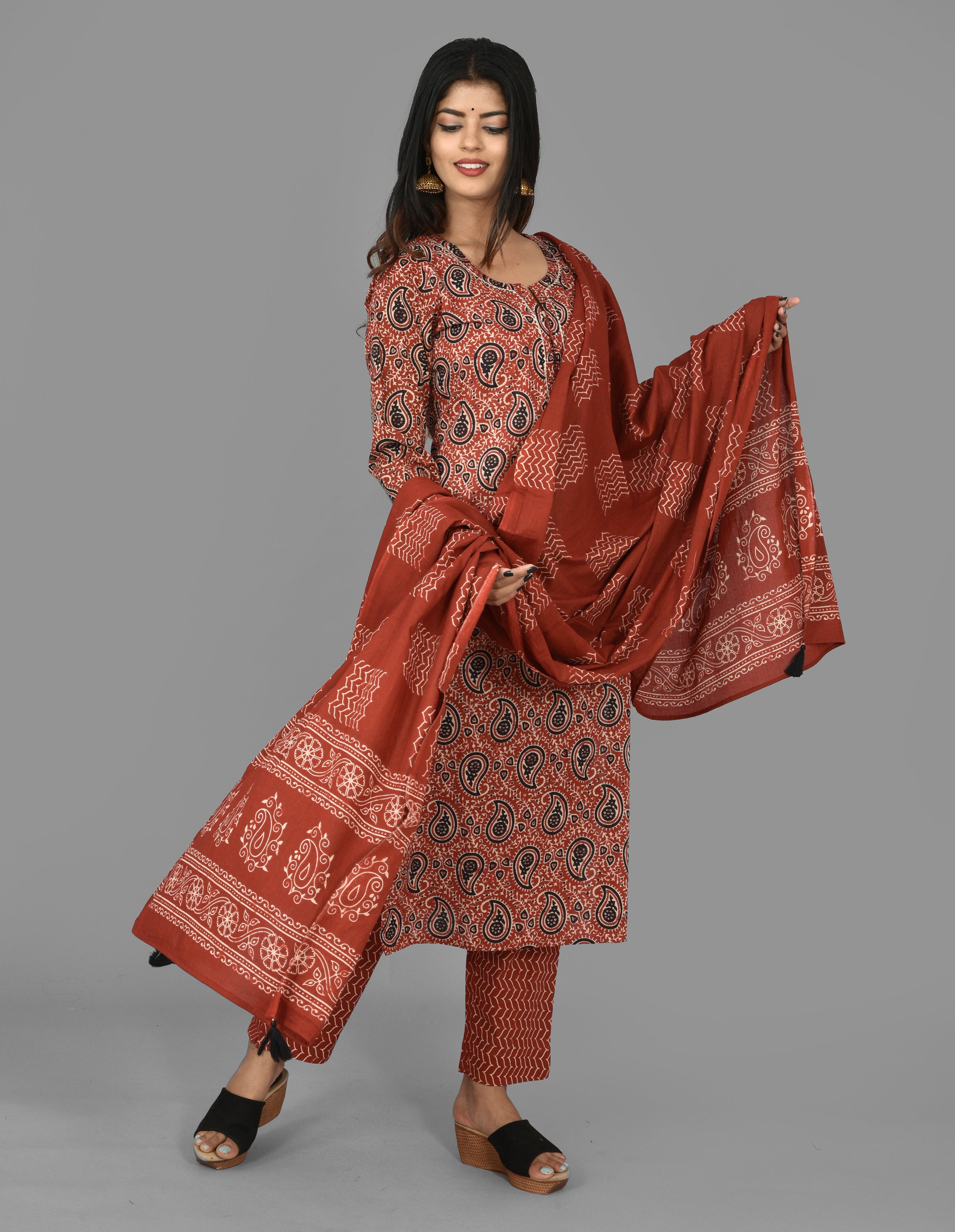 Kaajh Women's Red Paisley Print Cotton Suit SetRed Paisley Print Cotton Casual Kurta Suit Set By KAAJH. It Has a Elegant Work On The Front Panel Wh...
