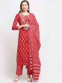 Red 7 white printed Kurta with Trousers with dupatta