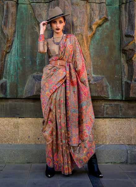 Experience timeless elegance with our Chikoo colour kashmiri pashmina organza silk saree. This exquisite saree combines the luxurious allure of pashmina silk with delicate resham thread weaving creating a masterpiece that effortlessly blends tradition and contemporary style. Perfect for special occasions, this saree includes unstitch blouse piece.Legal Disclaimer :Product color may slightly vary due to photographic lighting sources or your monitor settings.
