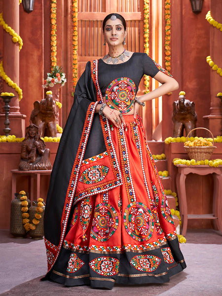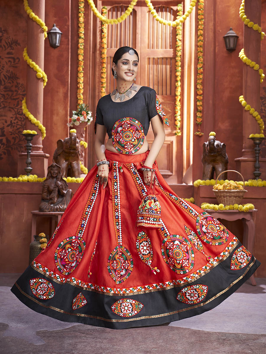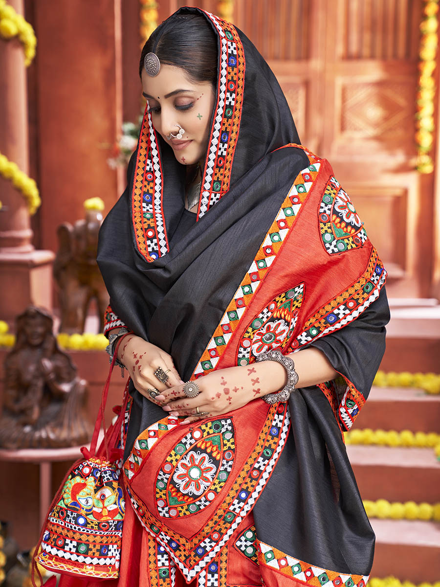 Red Art Silk Gamthi Work Designer Lehenga features a art silk blouse with art silk lehenga and dupatta. Embroidery have gamthi work with real mirror work and patch work. This Style is made in India and checked by hand to ensure high quality.
