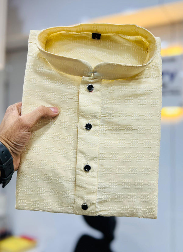 Prazu Fashion Cream Soft Jacquard With Self Buti KurtaAbout the Product: GENDER : male Colour : Cream Work/Pattern : Jacquard Fabric : Jacquard Nec...