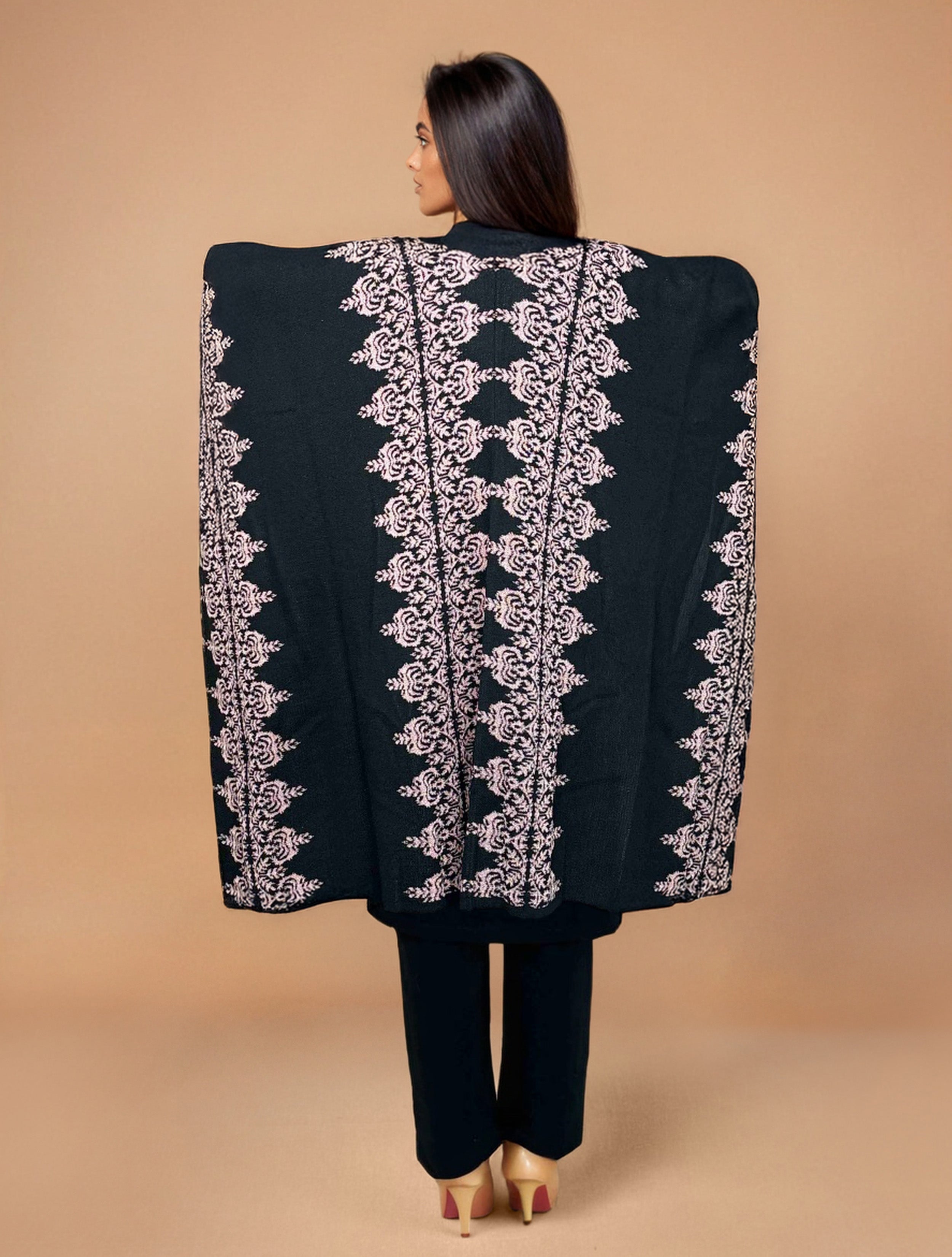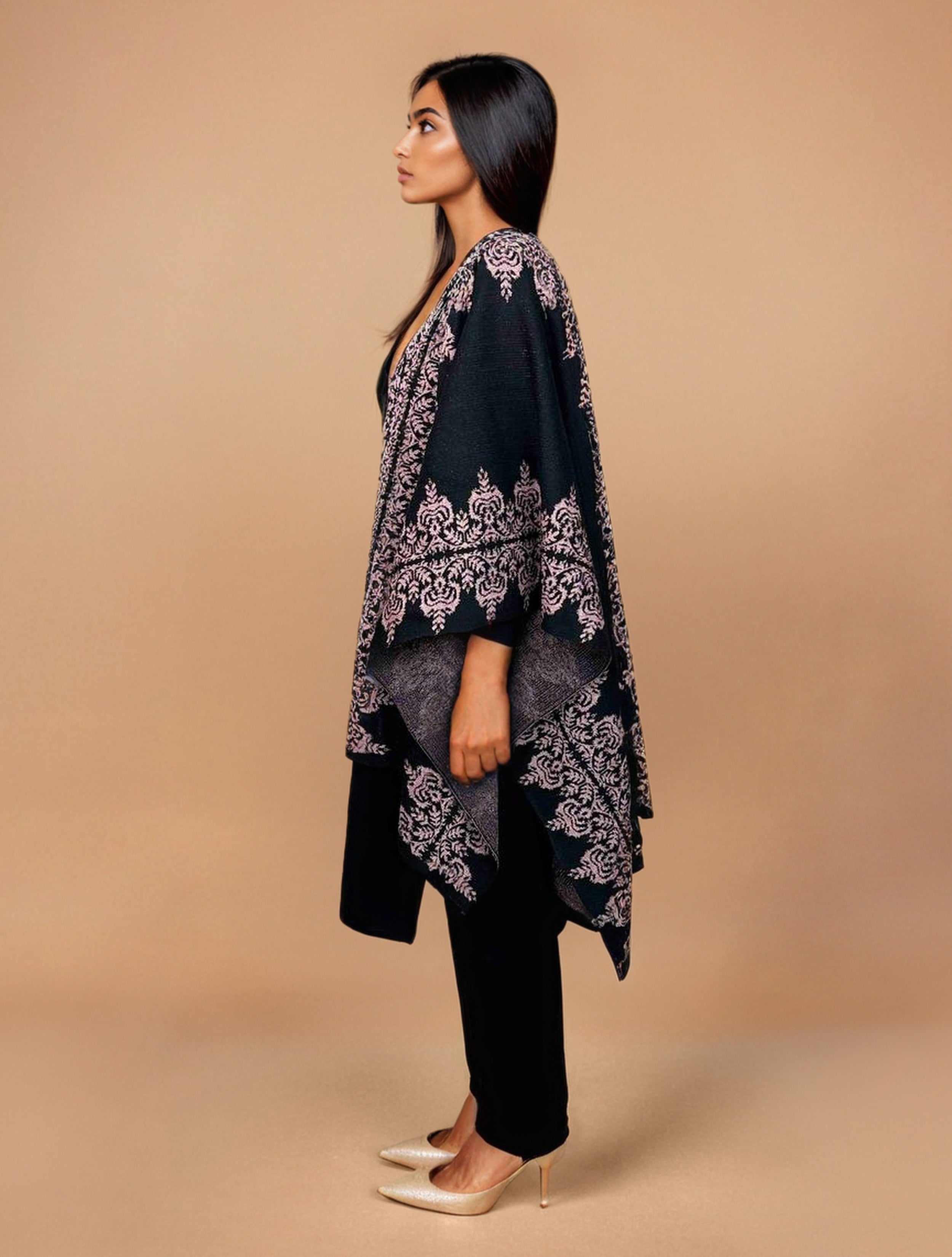 trueBrowns Black Woollen Pink Jacquard Kaftan Cape