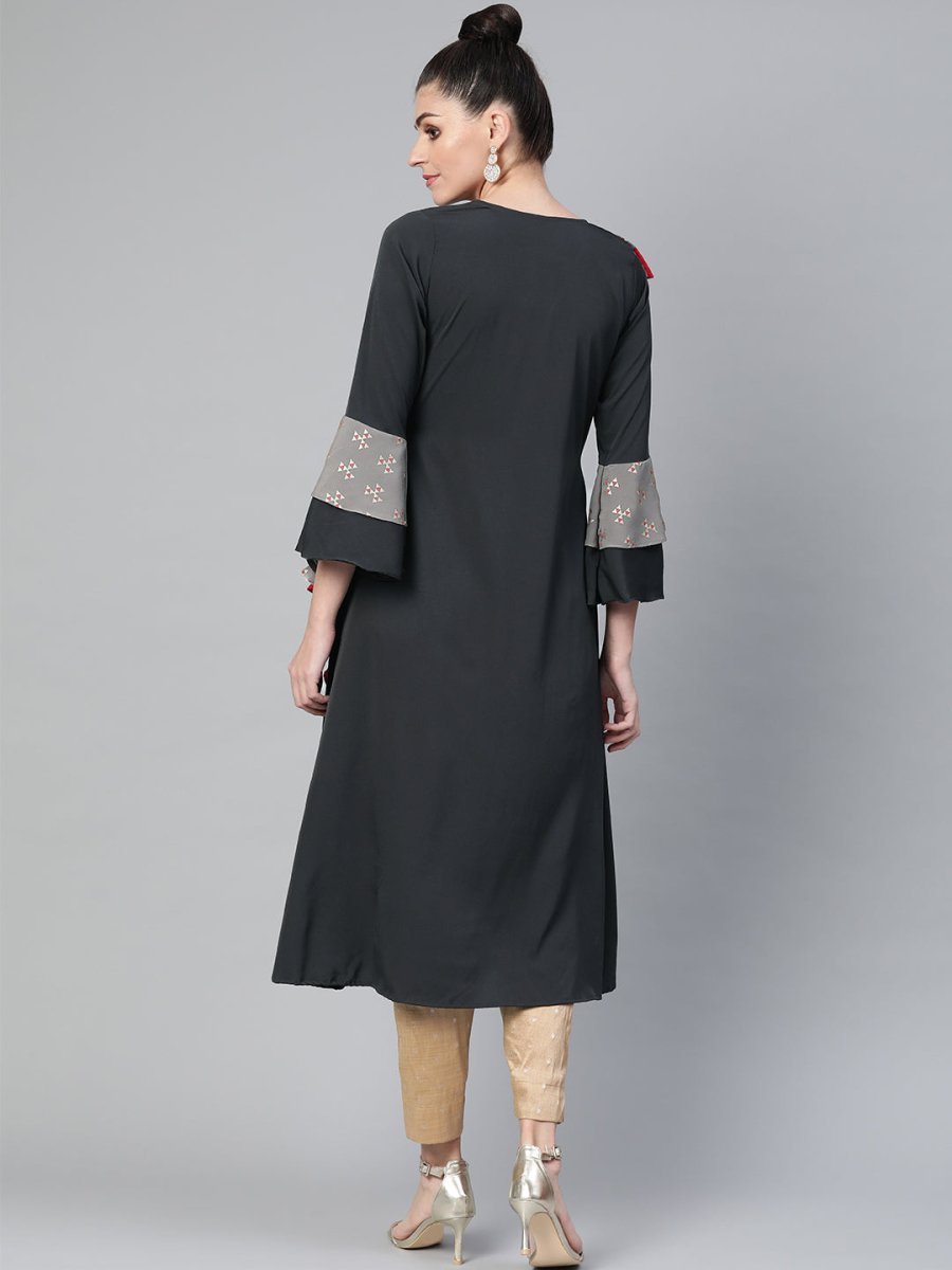 • Charcoal grey solid Angrakha A-line kurta with ruffles and printed detail has a V-neck, three-quarter sleeves, and flared hem