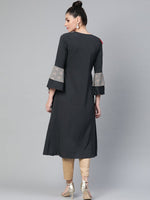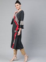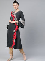 Ahalyaa Women Charcoal Grey Solid Ruffled Angrakha A-Line Kurta