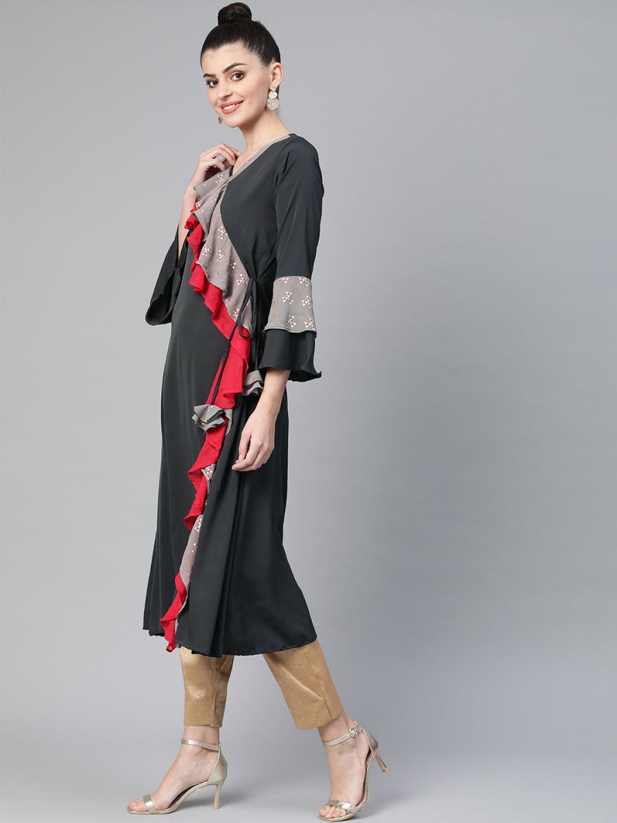 Ahalyaa Women Charcoal Grey Solid Ruffled Angrakha A-Line KurtaThis kurta by Ahalyaa is an elegant pick for your evening parties. The crepe kurta h...
