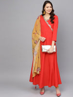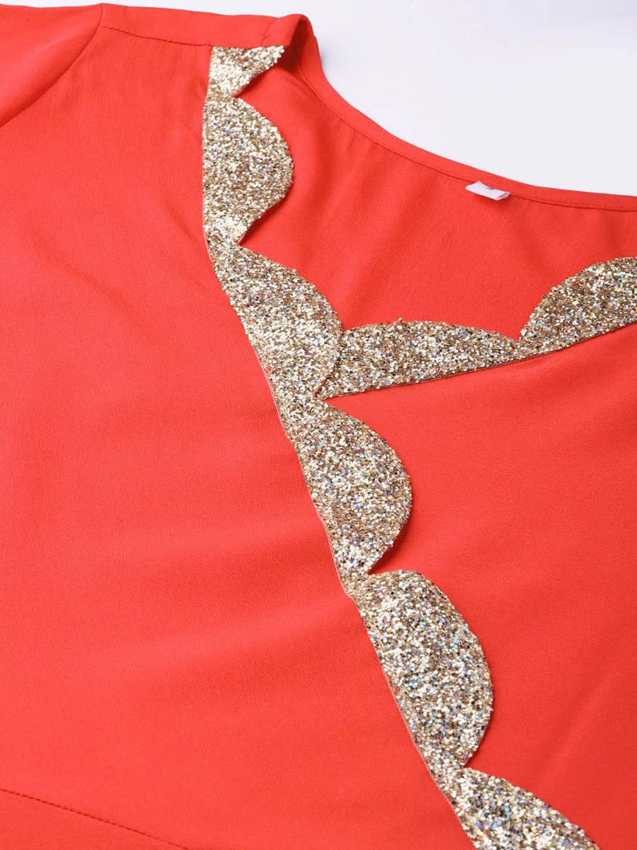 Red solid angrakha A-line kurta with shimmer detail, has a V-neck, three-quarter sleeves, flared hem