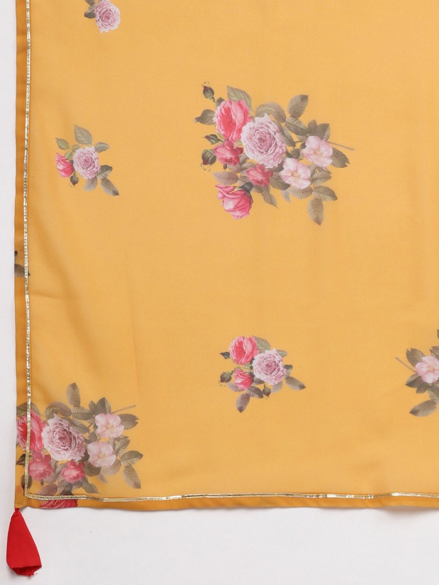Comes with a printed mustard yellow and pink dupatta with tasselled detail