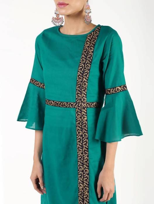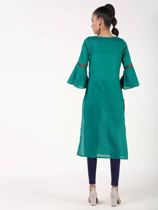 Aniyah Cotton Bell Sleeve Solid Straight Kurta In Turquoise Color: