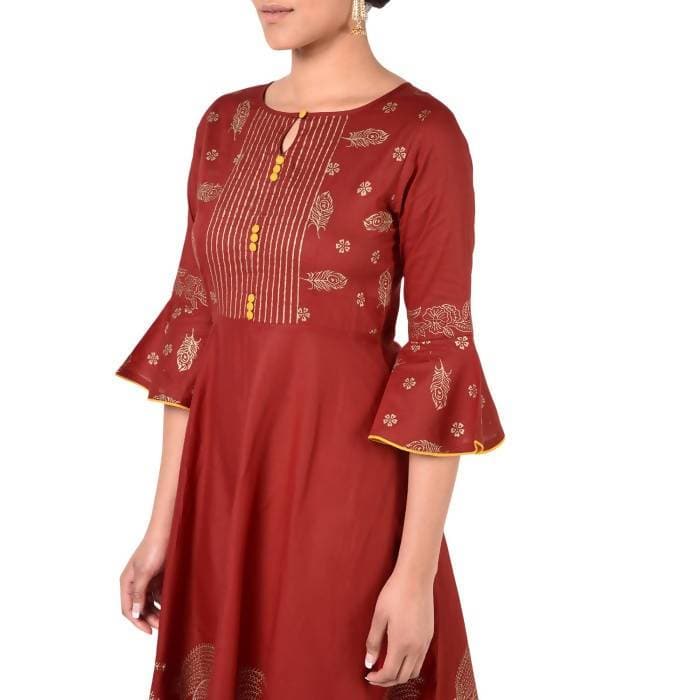 Aniyah Cotton Gold Print Flared Anarkali Kurta Maroon :