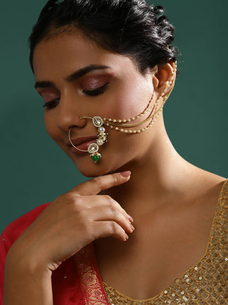 Gold Plated White Green Kundan Studded Beaded Chain Nose Pin - Ruby Raang - Distacart