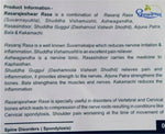 Dhootapapeshwar Rasarajeshwar Rasa contains Suvarnayukta Rasaraja Rasa 10 mg, Shuddha Vishamushti 100 mg, Ashwagandha 100 mg, Rasasindoor 40 mg, Guggul 30 mg (Dashamoola Vishesh Shodhit) Processed in Arjunpatra Kwath q.s. Bala Kwath q.s. Kakamachi Kwath q.s. as active ingredients.
