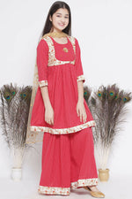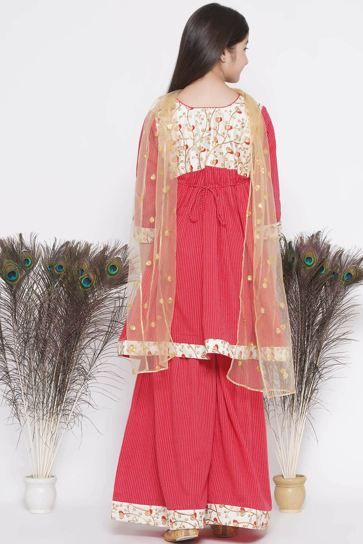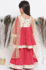 Little Bansi Floral Embroidery Jacket With Cotton Kantha Frock Sharara And Dupatta With Ghungroo Handwork - Red Additional Information: Color:...