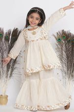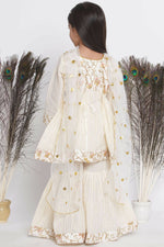 Little Bansi Floral Embroidery Jacket With Cotton Lurex Frock Sharara And Dupatta With Ghungroo Handwork - Cream
