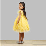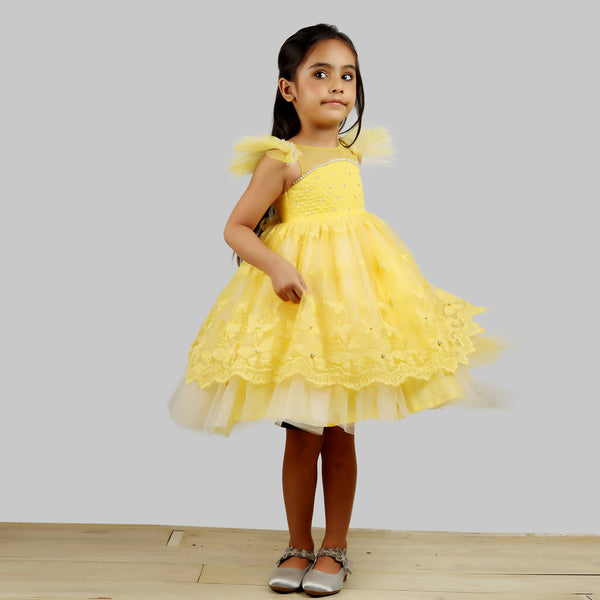 Pink Cow Fashions Yellow Dress With Net Layer At Bottom & Frill Sleeves
