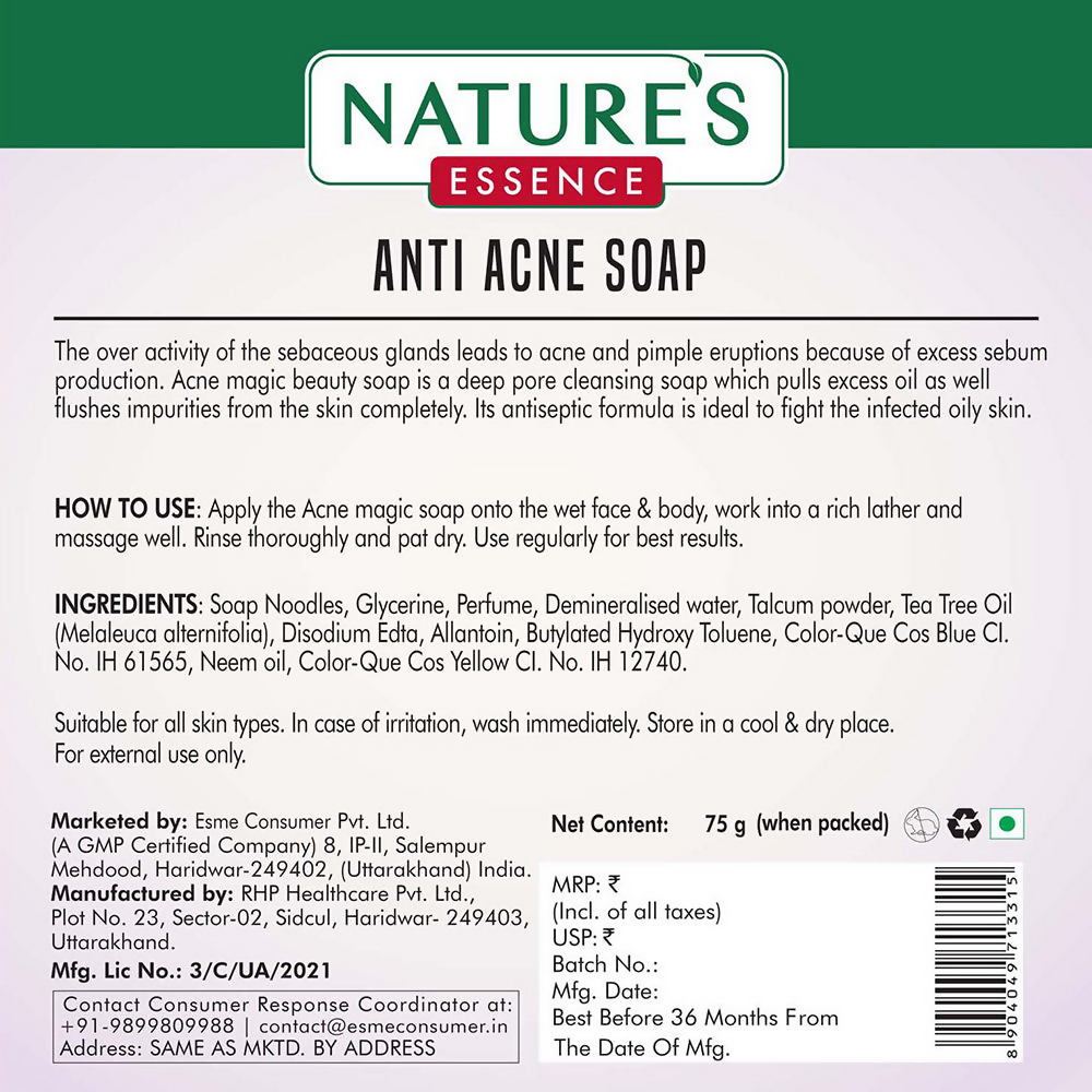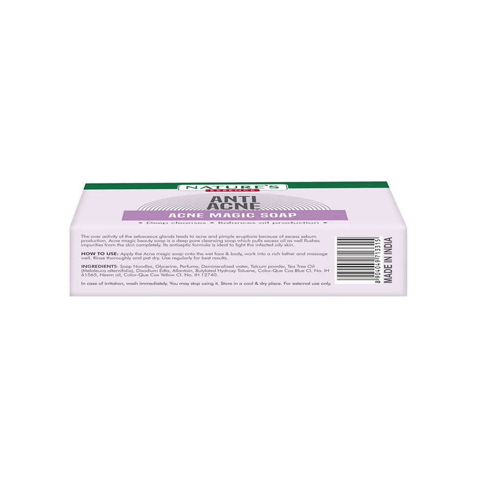 Nature's Essence offers Acne Magic Soap. Acne Magic Soap has anti-bacterial properties. Regular use of Acne Magic Soap reduces and prevents Live Pimples, Acne, and Black-Heads and keeps the face soft and glowing. The Acne Magic Soap reduces the overactivity of sebaceous glands and dries out excess sebum oil secretions.