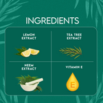 • Tea tree extract, Lemon extract, Neem extract, Beet root extract, Sodium lauryl sulphate, Cocoamidopropyl betain, Sodium cocoyl glutamate, Disodium cocoyl glutamate, Cocodiethanolamide, Olivem 400(olive oil derivatives), Vitamin E, Glycerin, Phenoxyethanol, Sodium Benzoate, C.I.42090 & C.I.19140, Parfum, Purified water.