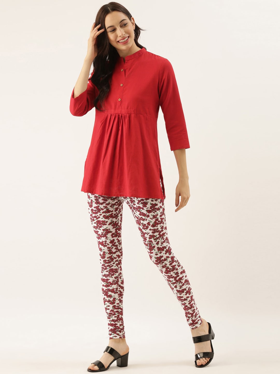 • Pair these leggings with a white Kurti and a pair of flats. Add jhumkas and kohl eye makeup to complete an ethnic festive look.