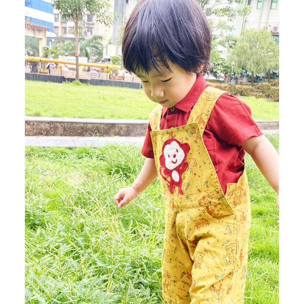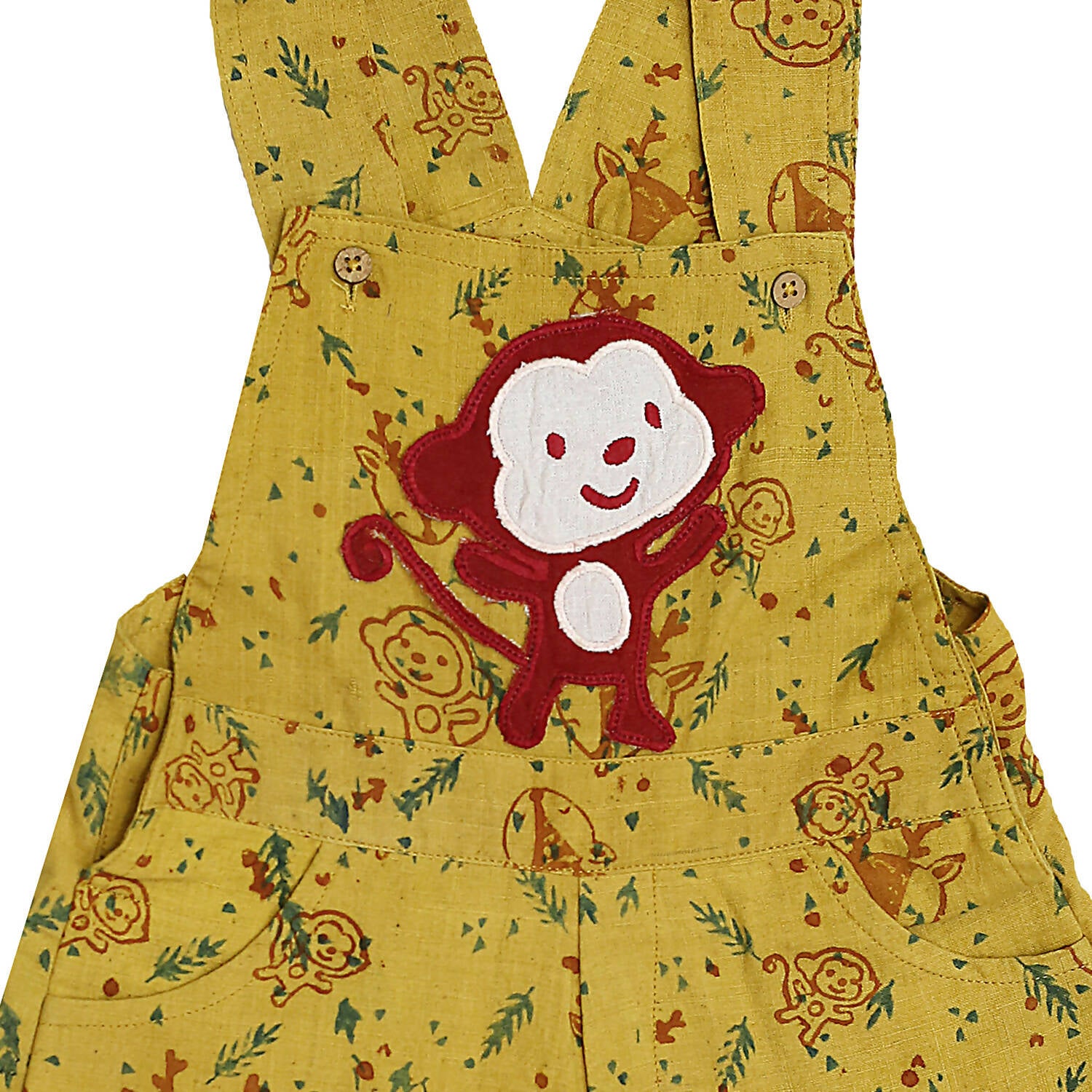 • Dungaree style Romper features an embroidered monkey patch and patch pockets in front, styled with a classic shirt detailed with stand collar, paw patches on sleeves and back, wooden buttons on front placket opening, giving a casual look. The entire set is handblock printed and natural dyed on Khadi.