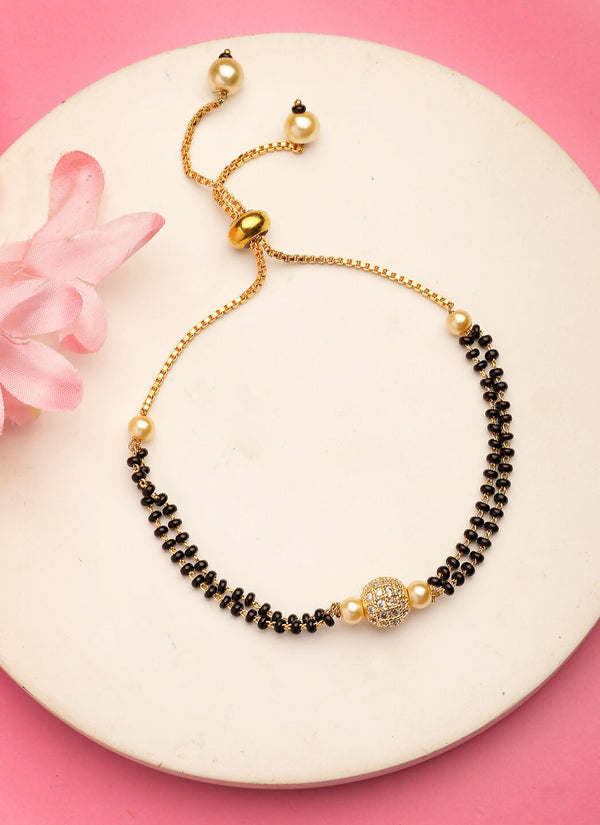 NVR Women Gold-Polished & Black Brass AD-Studded Hand Mangalsutra Bracelet
