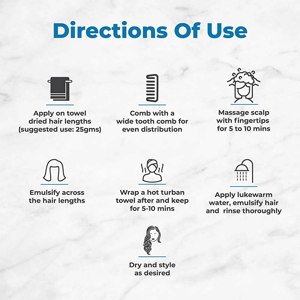 • Take 25 gms of mask Apply section by section on towel dried hair lengths Comb with a wide tooth comb for even distribution Massage scalp with fingertips for 5 to 10 mins Emulsify across the hair lengths in a downward milking fashion For best results, wrap a hot turban towel after emulsification and keep for 5-10 mins Apply luke warm water and emulsify hair. Remove mask with fingers Rinse thoroughly Dry hair