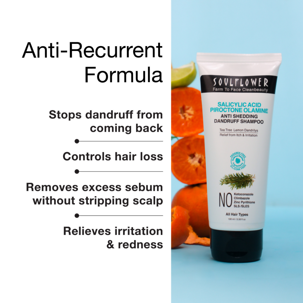 • Soulflower anti-dandruff shampoo is formulated to tackle flakes and keep them at bay. This shampoo is an anti-recurrent, fast-acting 4-in-1 formula for dandruff control, hair conditioning, hair loss control, & scalp conditioning. It’s a scalp rescue shampoo enriched with Piroctone Olamine which is clinically proven to reduce dandruff & prevent itchy scalp. Studies suggest that, over time, dandruff-causing fungi develop resistance to ketoconazole, making anti-dandruff shampoos less effective in preventing dandruff.