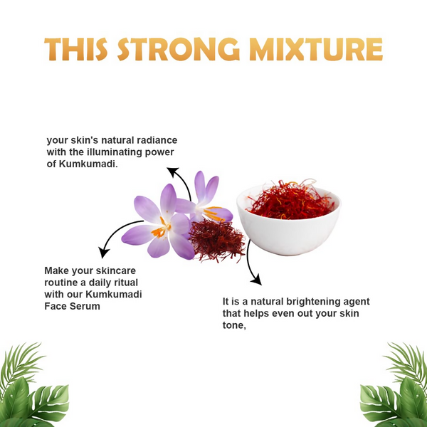 • Illuminate with Saffron Magic: Immerse yourself in the antioxidant magic of Saffron (Kesar). Kumkumadi Oil, enriched with Saffron, Sandalwood Oil, Goat Milk, and Manjishtha, is your go-to for enhanced skin complexion and radiance. Experience the powerful skin lightening and improved elasticity that redefine your skin's vitality. Bid farewell to under-eye dark circles and puffiness.