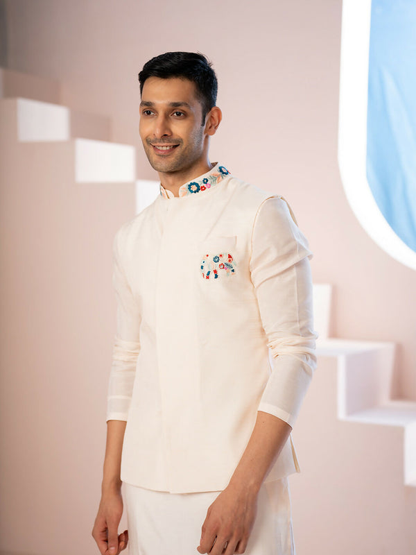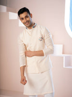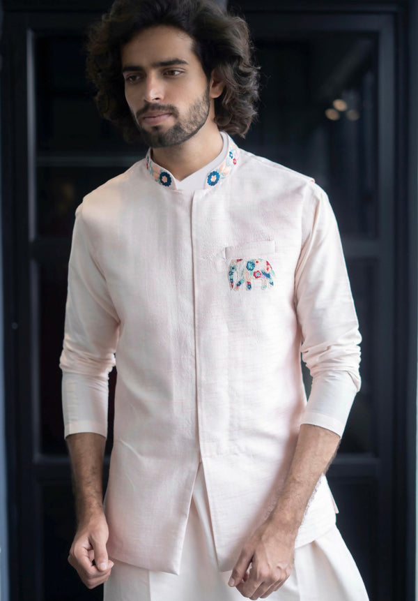 With multicolored embroidered work at the neck and pocket, the design enhances the beauty of its calming light peach ccolorNehru Jacket set. Best worn for a minimal yet classy look. Made for the No-Fuss men. he product comes with a kurta which is made of Falling Raw silk and pant which is made of cotton lycra both together to complete the look.