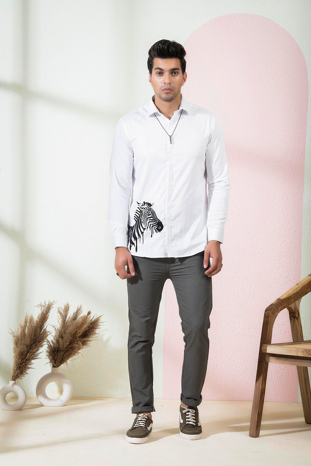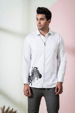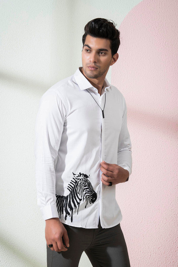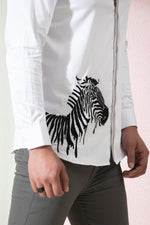 This white shirt is made of cotton satin, giving it a luxurious and smooth texture. On the right bottom corner, there is a beautiful zebra embroidery in black and white, adding a touch of wild and playful energy to the shirt. This shirt is perfect for those who want to add a unique and edgy twist to their outfit.