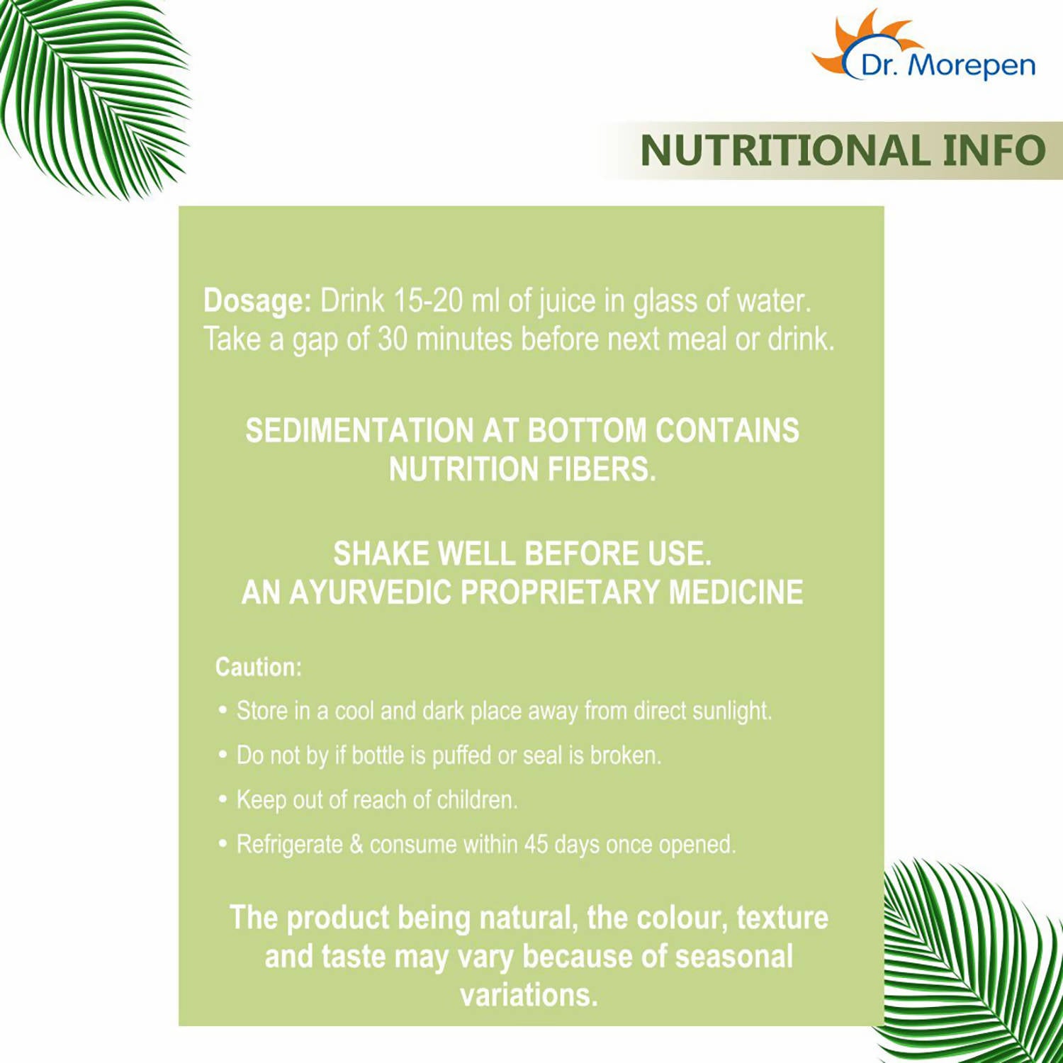 Dr. Morepen Cold Pressed Raw Amla JuiceDirections to Use:: Take 15-30 ml(1-2 Table spoon) in 200 ml ( 1 glass). Take a gap of 30 minutes before the...