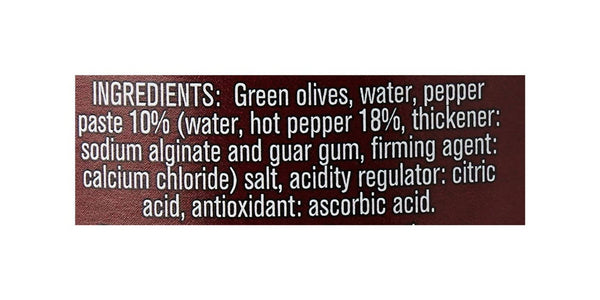 • Manzanilla Spanish olives stuffed with hot pepper paste