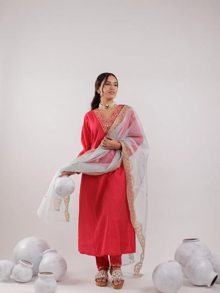 Fuchsia Dori_Embroidery Silk Blend A-Line Kurta And Trouser with dupatta Set