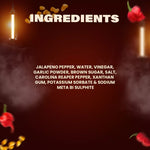 • Jalapeno Pepper, Carolina Reaper Pepper, Vinegar, Brown Sugar, Garlic powder, Salt, Water, Xanthan Gum, Potassium sorbate & Sodium Meta BI Sulphite.