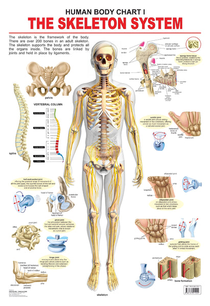 The skeletal system works as a support structure for your body. It includes all of the bones and joints in the body. ‘The Skeletal System’ – this wall chart features one large illustration showing the anterior view of the male skeletal system. It also includes small illustrations that show a portion of the spine, ligaments, pelvis, and portion of other bones with all important information in an easy-to-read and simple-to-understand text.