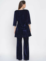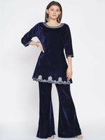 Women Republic Navy Blue Velvet Embroidered Kurta With Bellbottom PantsWomen Republic Navy Blue Velvet Embroidered Kurta with Bellbottom Pants Col...