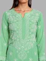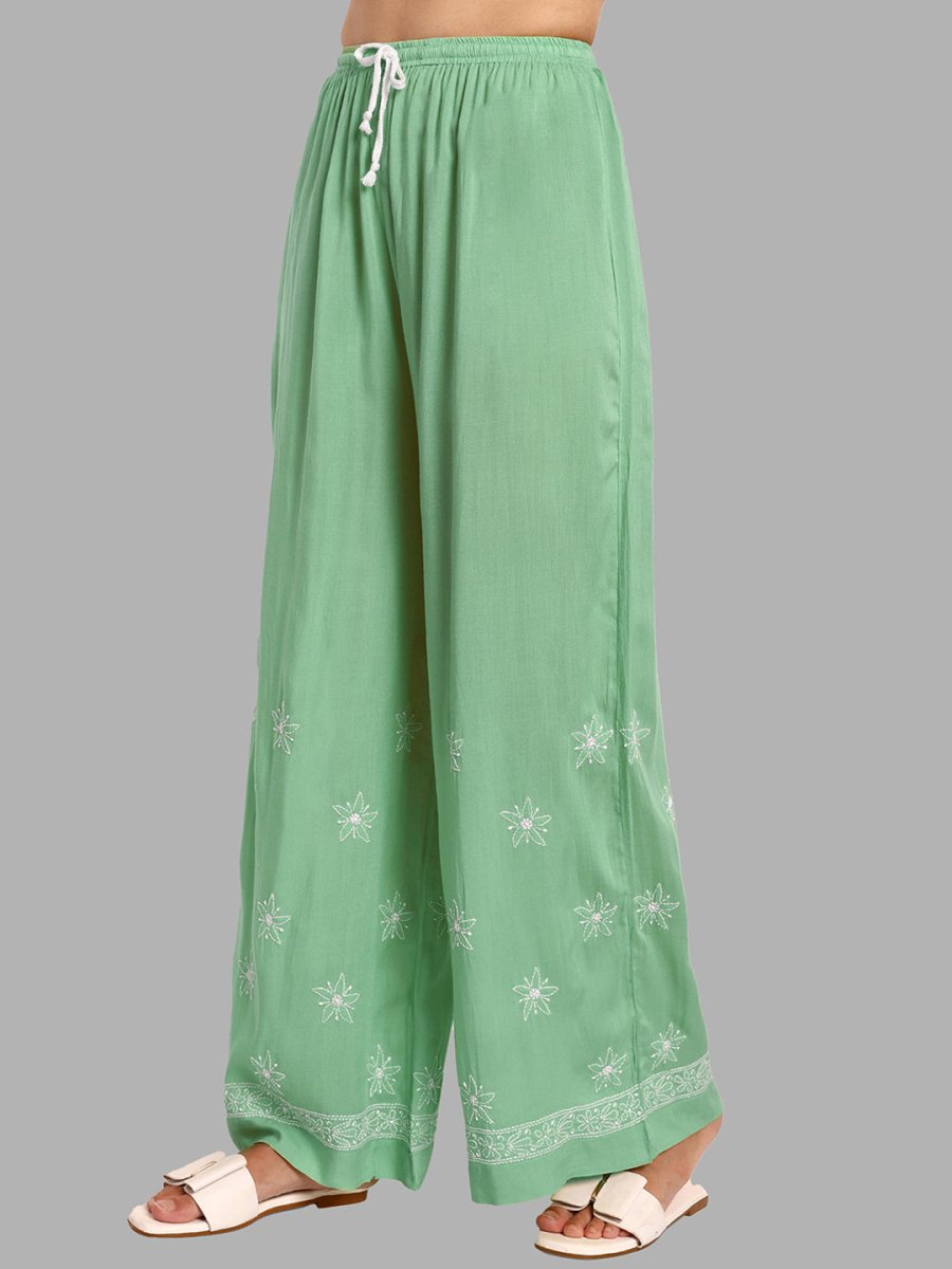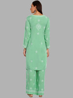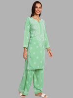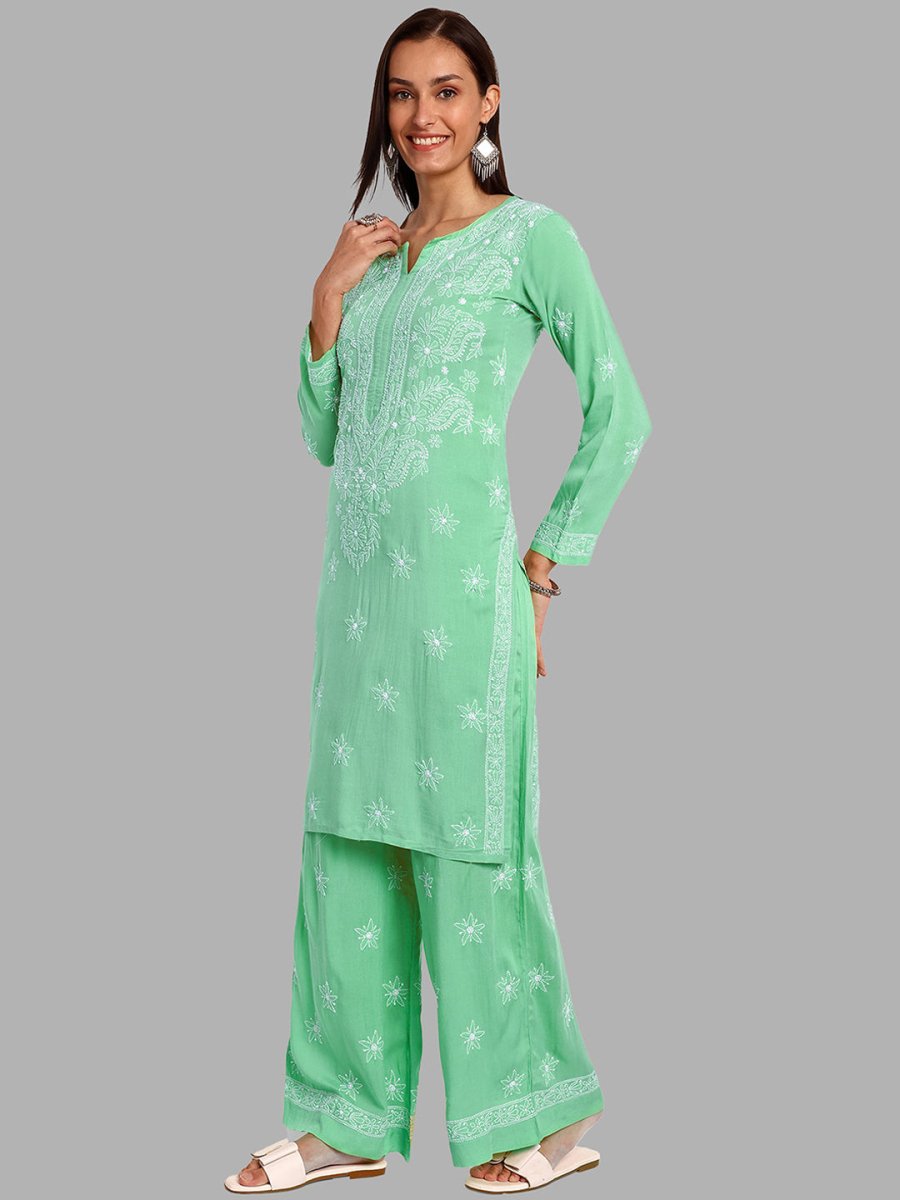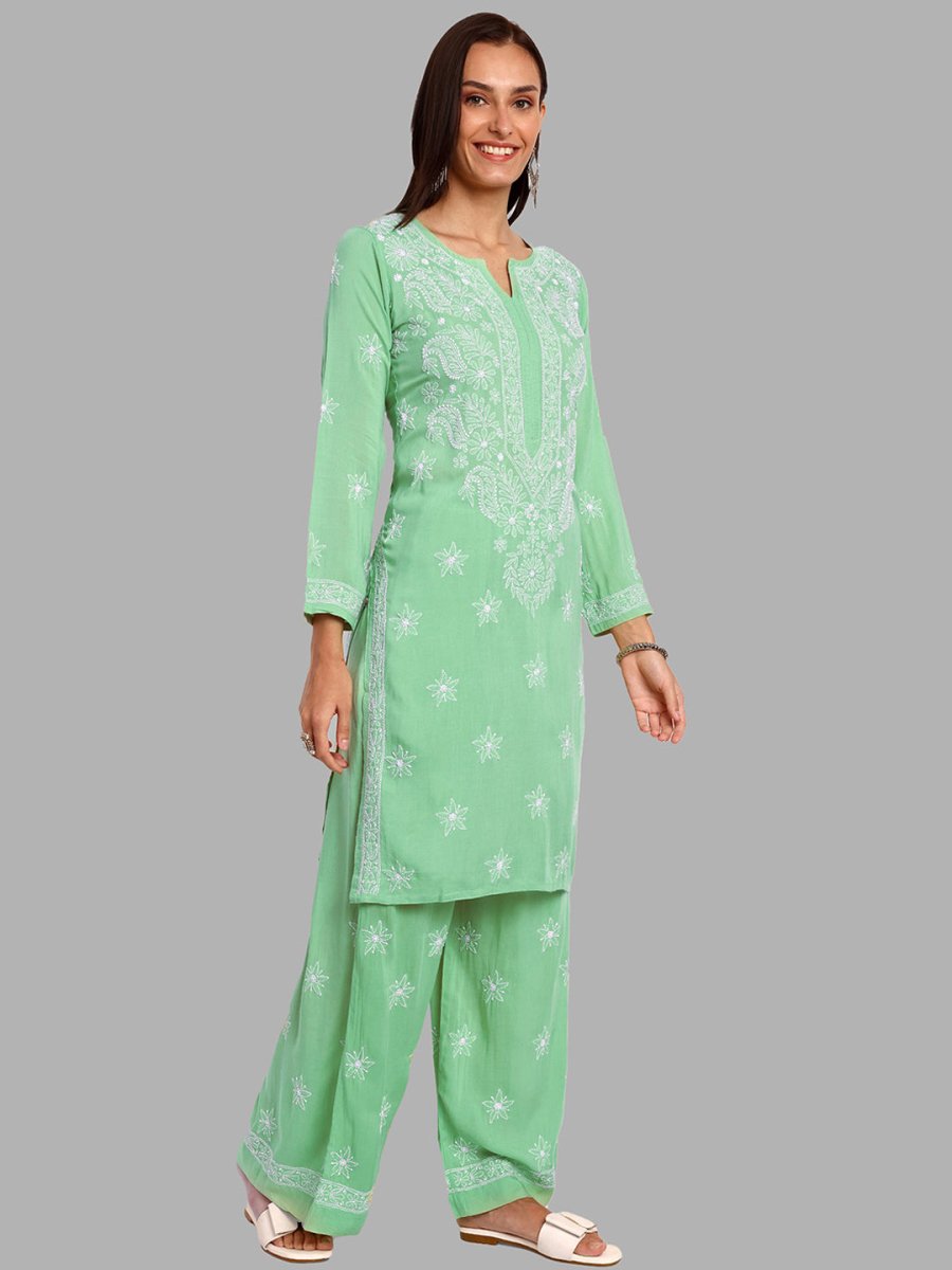ADA Floral Embroidered Long Sleeves Regular Lucknowi Chikankari Kurta With Palazzos Product Details Sea green and white embroidered kurta with p...
