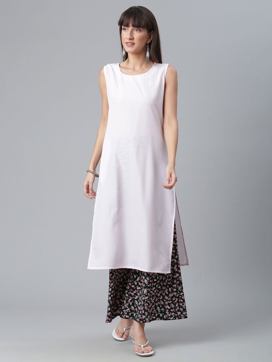 Light Pink Crepe Solid Kurta, it has Scoop Neck and Sleeveless, Side Pocket In kurti.