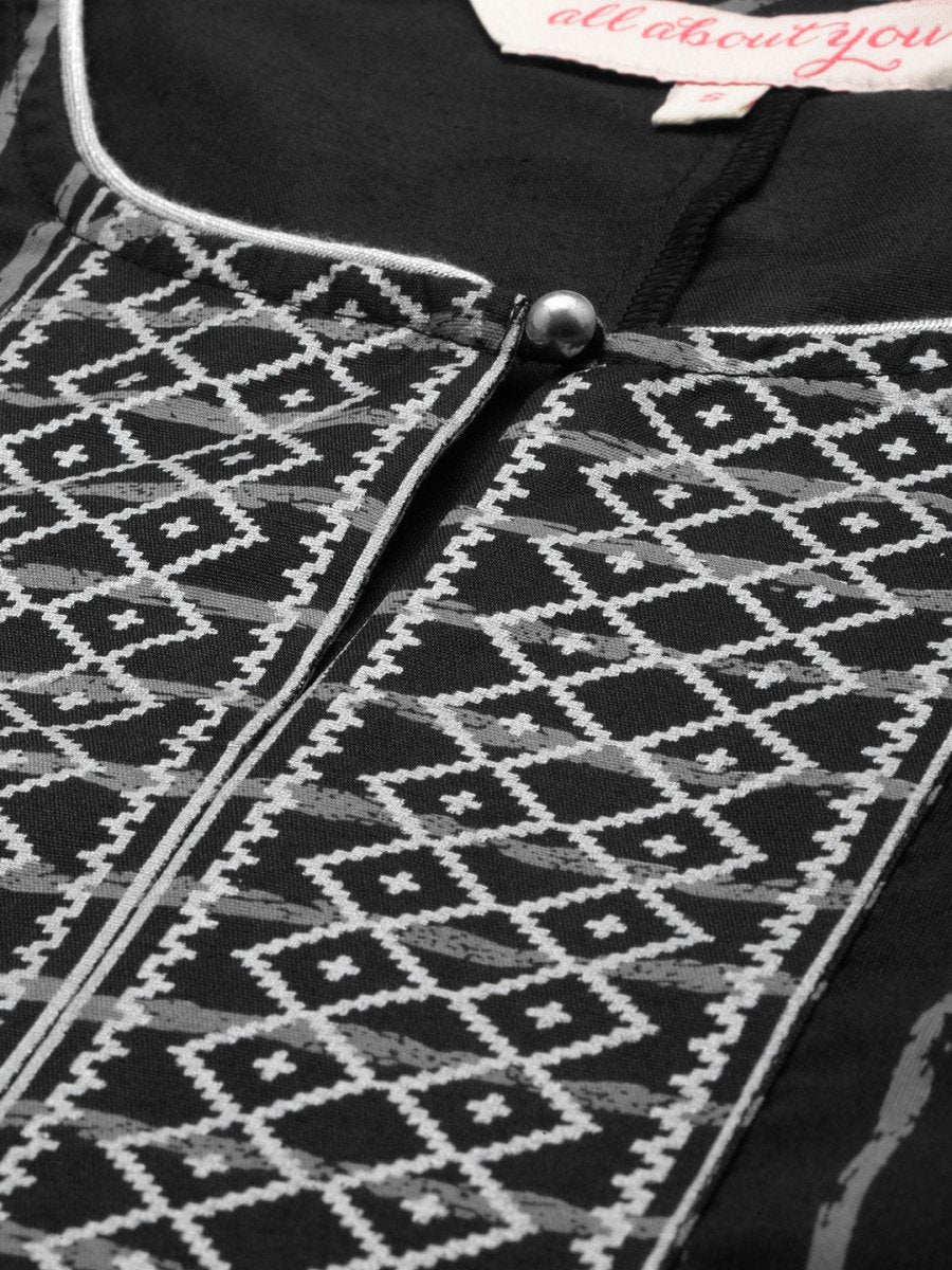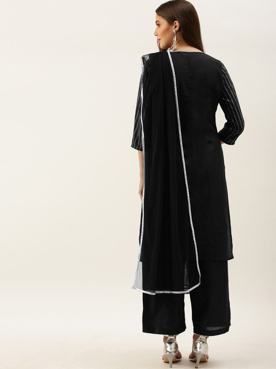 All About You Women Black & Grey Striped Keyhole Neck Kurta with Palazzos & Dupatta Product Details Black striped Kurta with Palazzos wi...