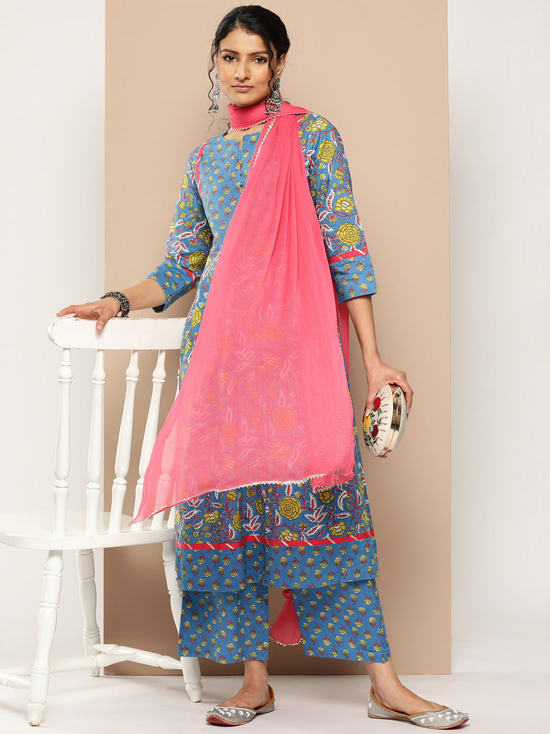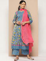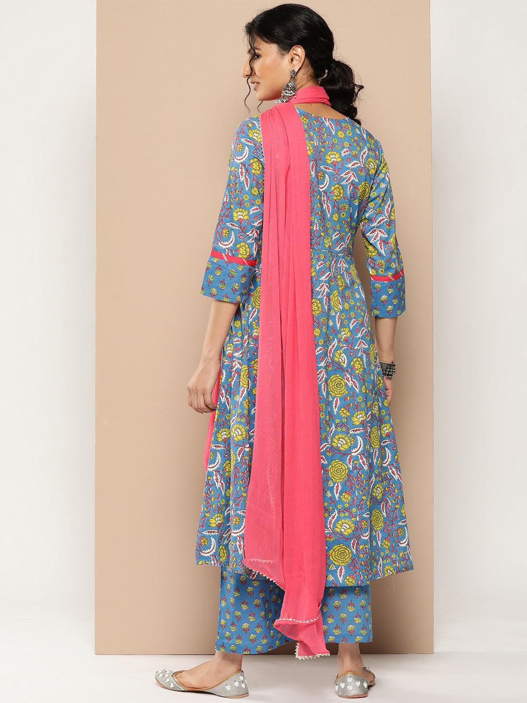 Blue Floral Printed Anarkali Kurta With Printed Palazzo And Dupatta, Round Neckline,Contrast Taping ,3/4Th Slit,Flare Hemline