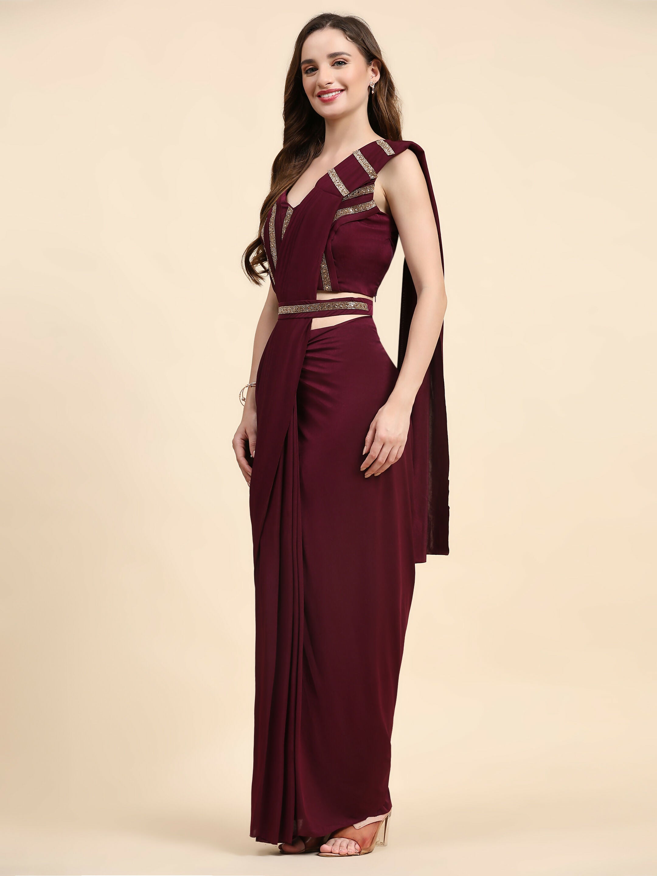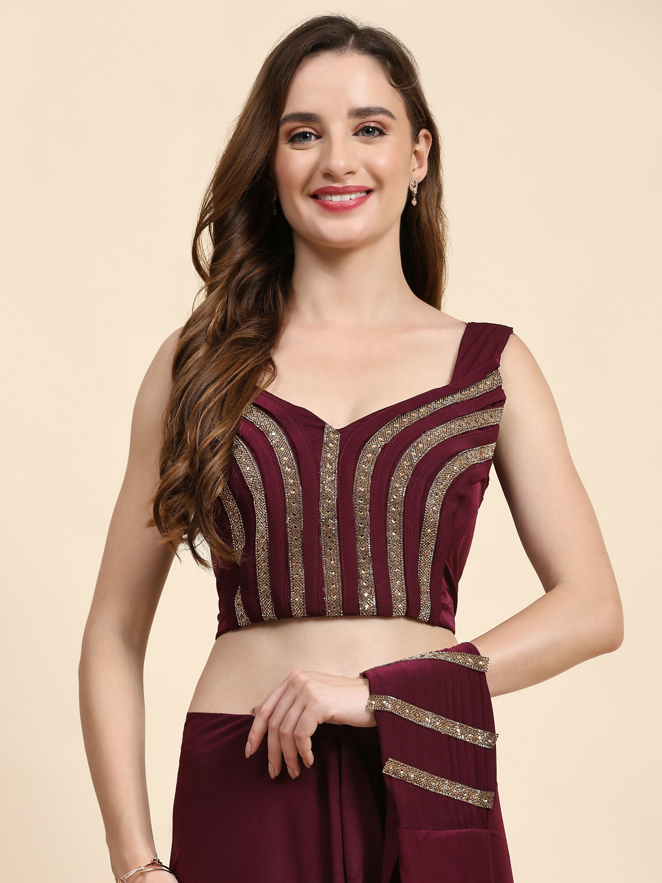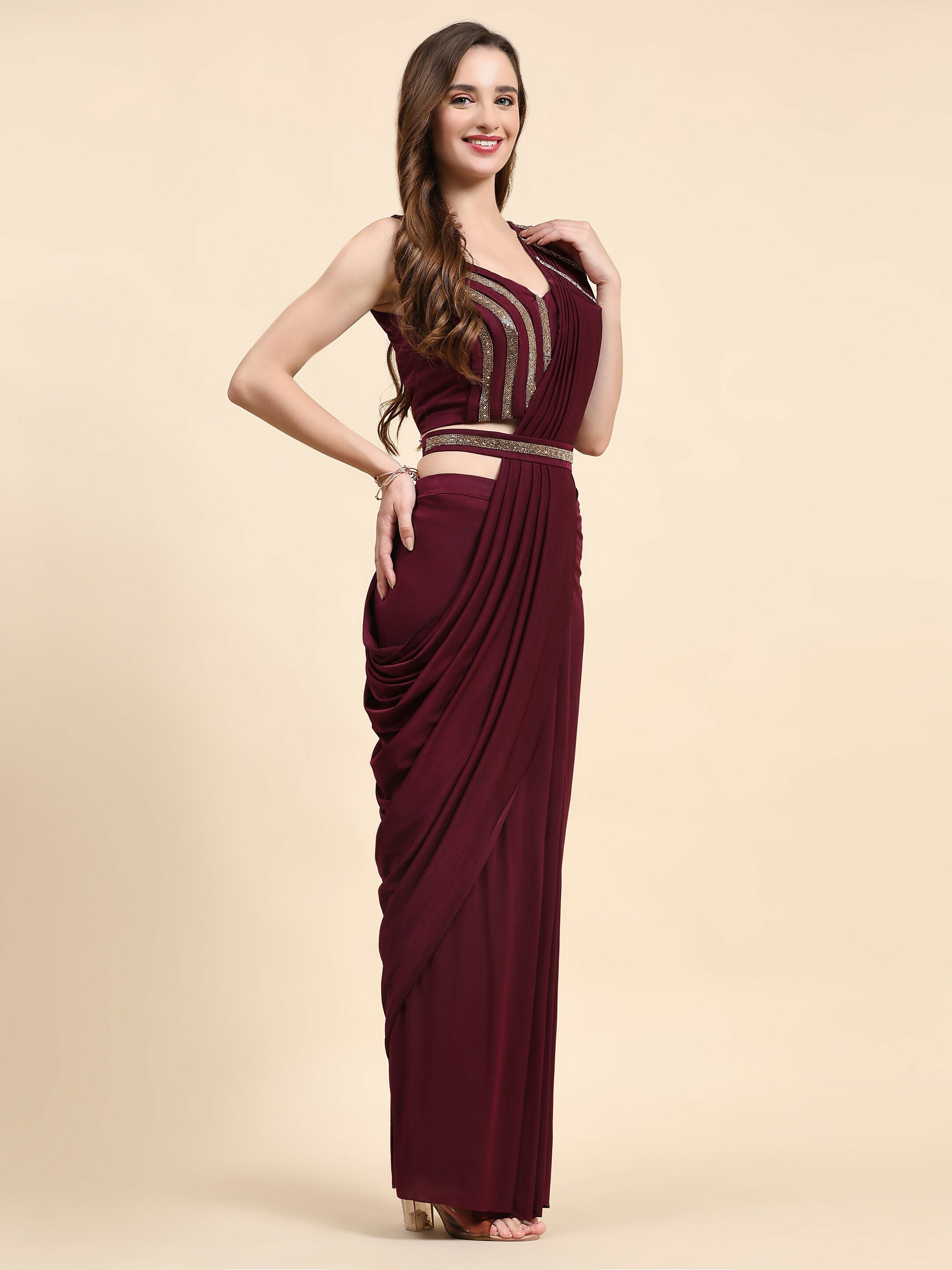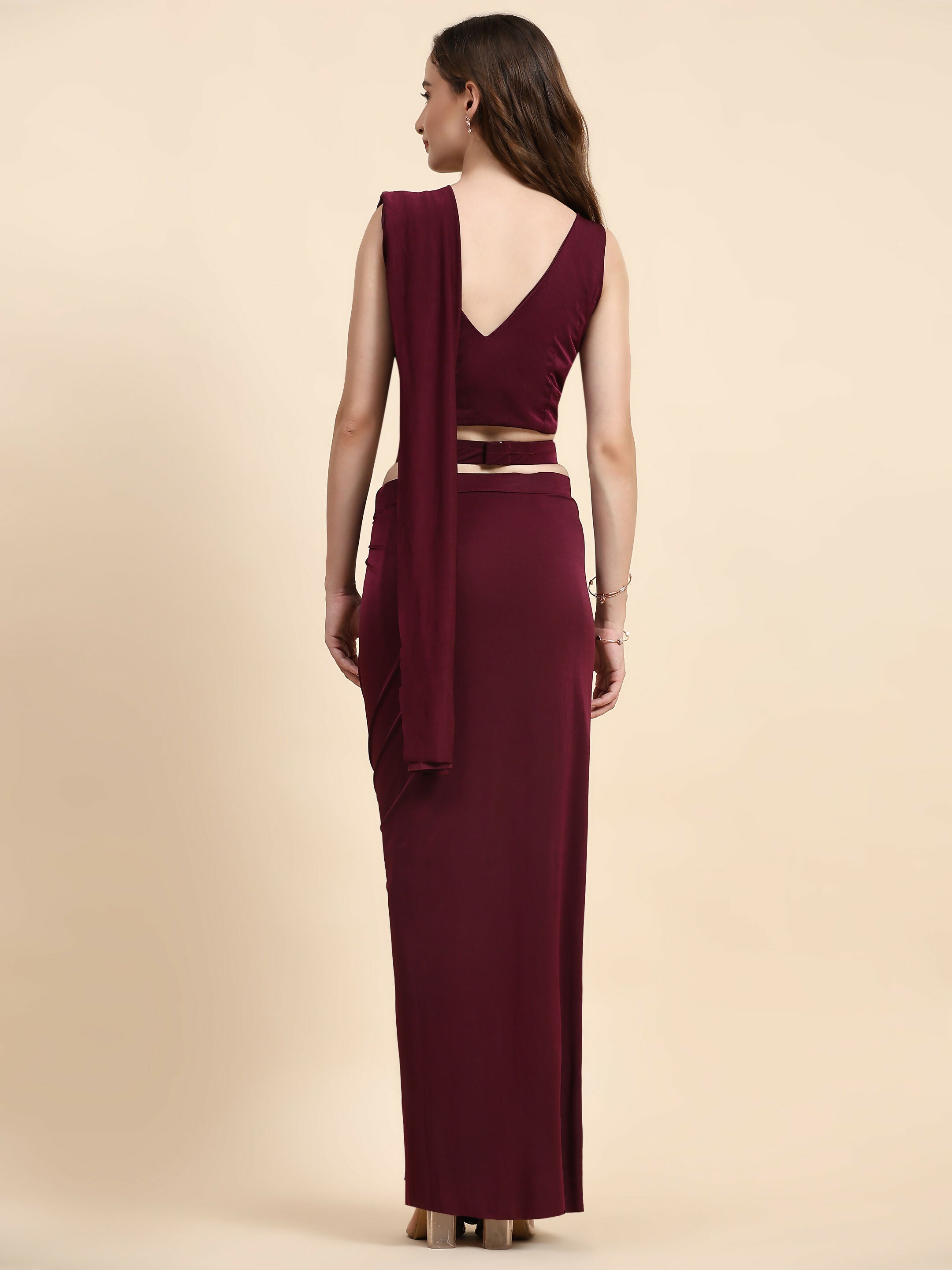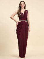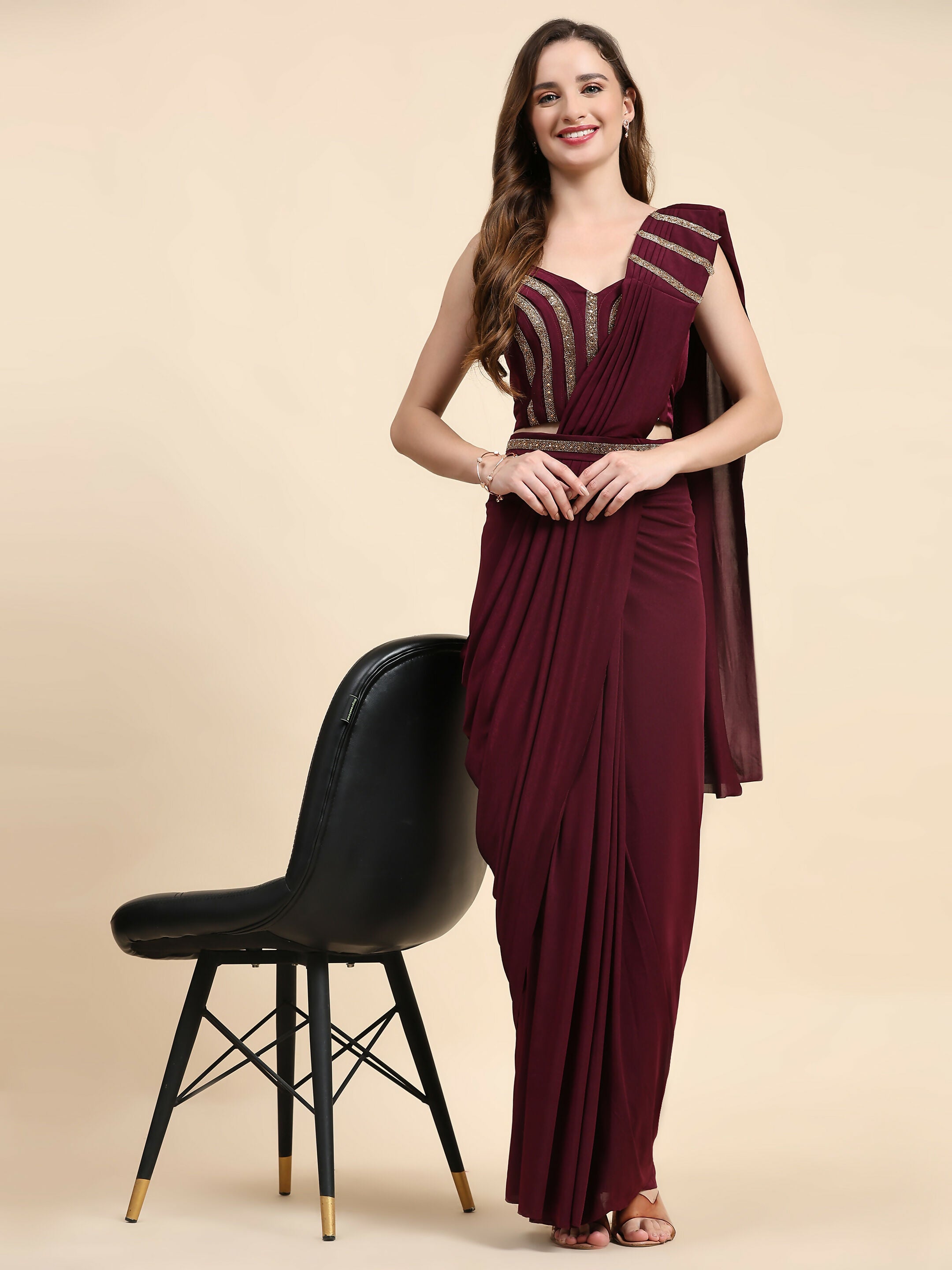Maroon Polyester Solid Ready to Wear Saree with stitched Blouse - Nita