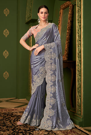 Evanik Grey Mos Silk With Handwork Butterfly Design Saree With Unstitched Blouse