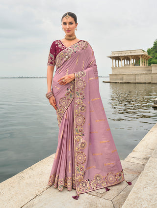 Monjolika Fashion Mauve Viscose Tissue Silk Saree With Embroidery & Cutwork Border