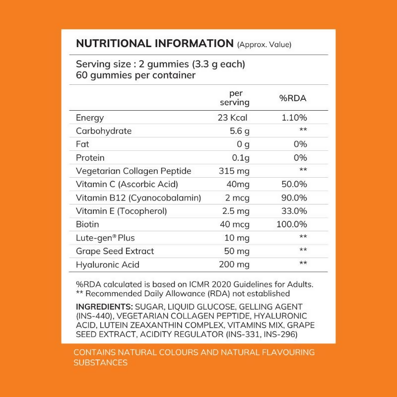 • Sugar, Liquid Glucose, Gelling Agent (Ins-440), Vegetarian Collagen Peptide, Hyaluronic Acid, Lutein Zeaxanthin Complex, Vitamins Mix, Grape Seed Extract