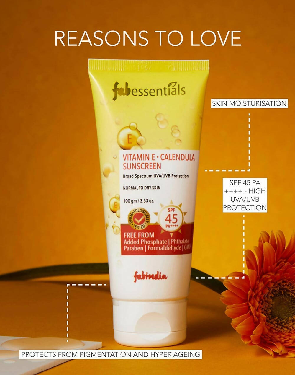 Fabessentials Vitamin E Calendula Sunscreen SPF 45 PA++++About the product:Fabessentials Vitamin E Calendula Sunscreen with SPF 45 neutralization o...